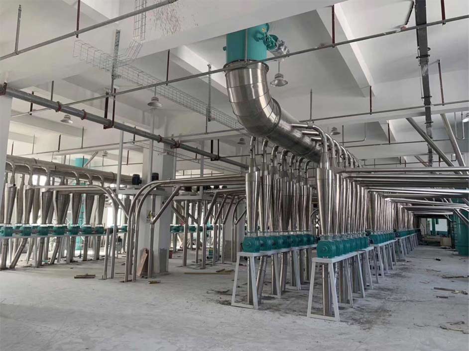 1000面粉加工設(shè)備,該工藝以小麥為原料,日處理小麥1000噸,是一條全自動(dòng)生產(chǎn)線,清理、去石、打麥、除塵、著水、凈糧二次清理、輸送等工段。